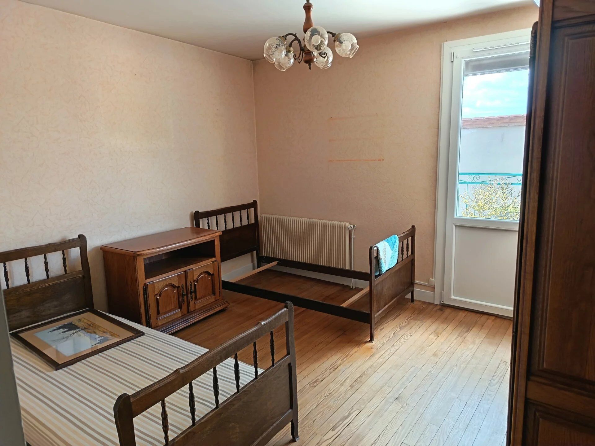 Entrée avec dégagement et placard, cuisine séparée, séjour, deux belles chambres une salle d’eau, un WC, balcon et terrasse.